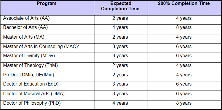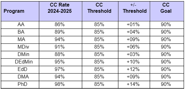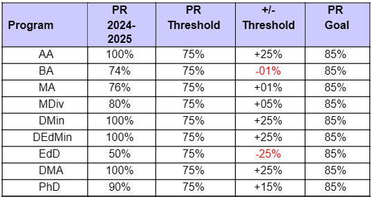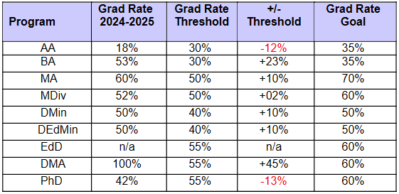 In the charts below, the “NA” designation means that no students were in the cohort. Thus, we had no ThM students in the cohort that graduated in 2024-2025. A designation of 0% means that students were in the cohort but did not graduate within the 200% timeframe. Thus, we had AA students who began with the cohort but did not graduate within the four-year (200%) timeframe for that program.