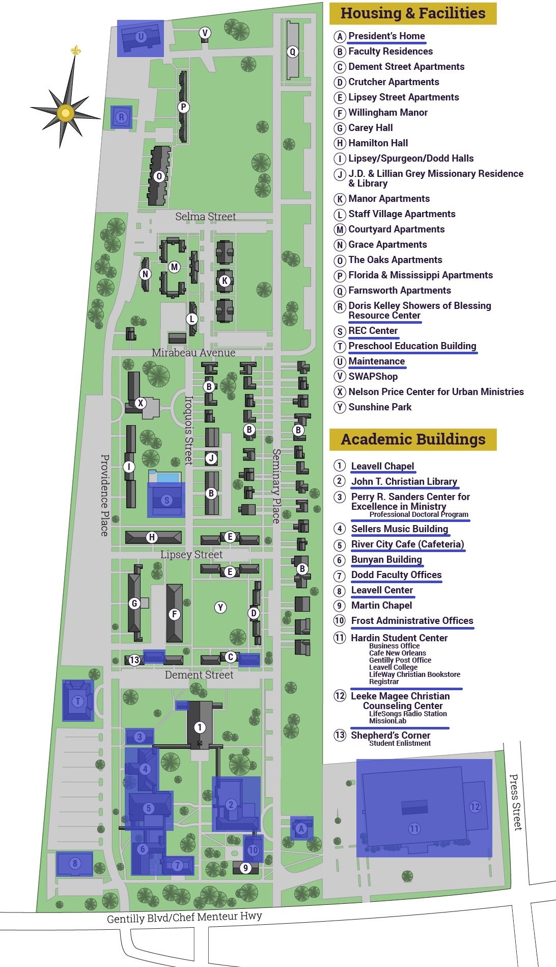 *Each number or letter corresponds to a building on the campus map. To view the Campus Map, click here .