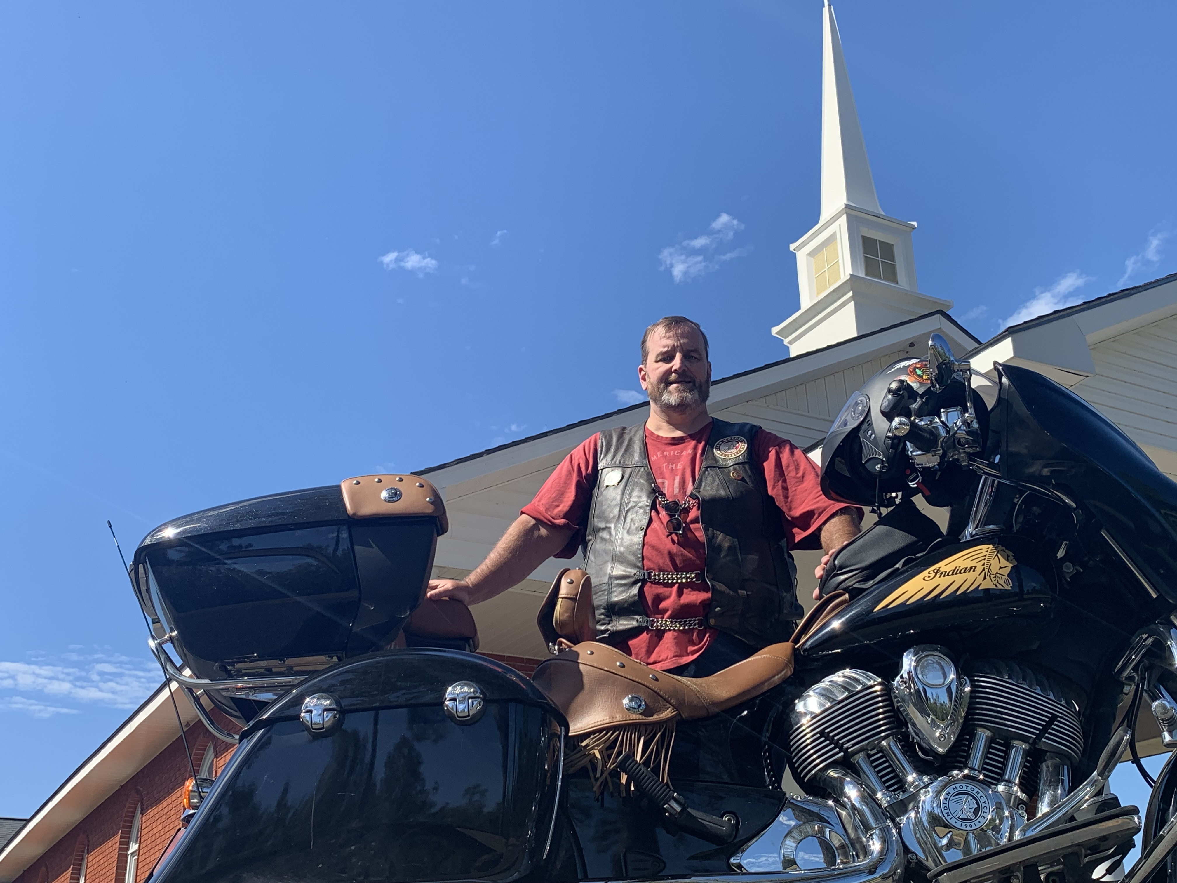 Conversations about faith came up naturally as Farmer answered questions about his Indian Chieftain motorcycle, where he had traveled, and why he was visiting churches, Farmer explained.